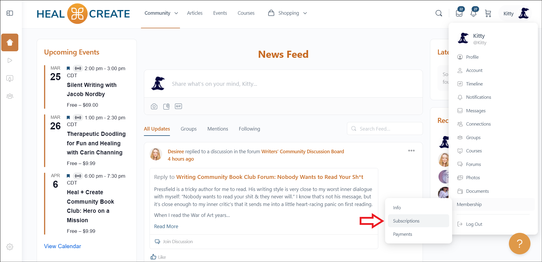 To update your payment method, log into your account and click on your name in the top right corner of the page. Near the bottom of that menu, you will see a Membership option. Hover over that tab and select Subscriptions from the menu that appears.