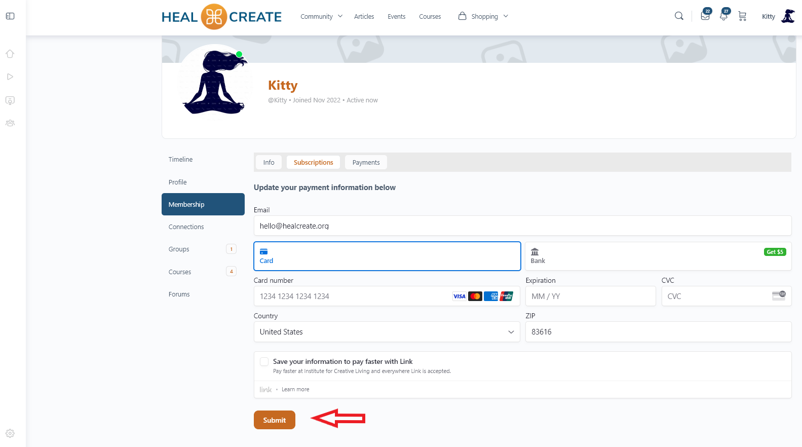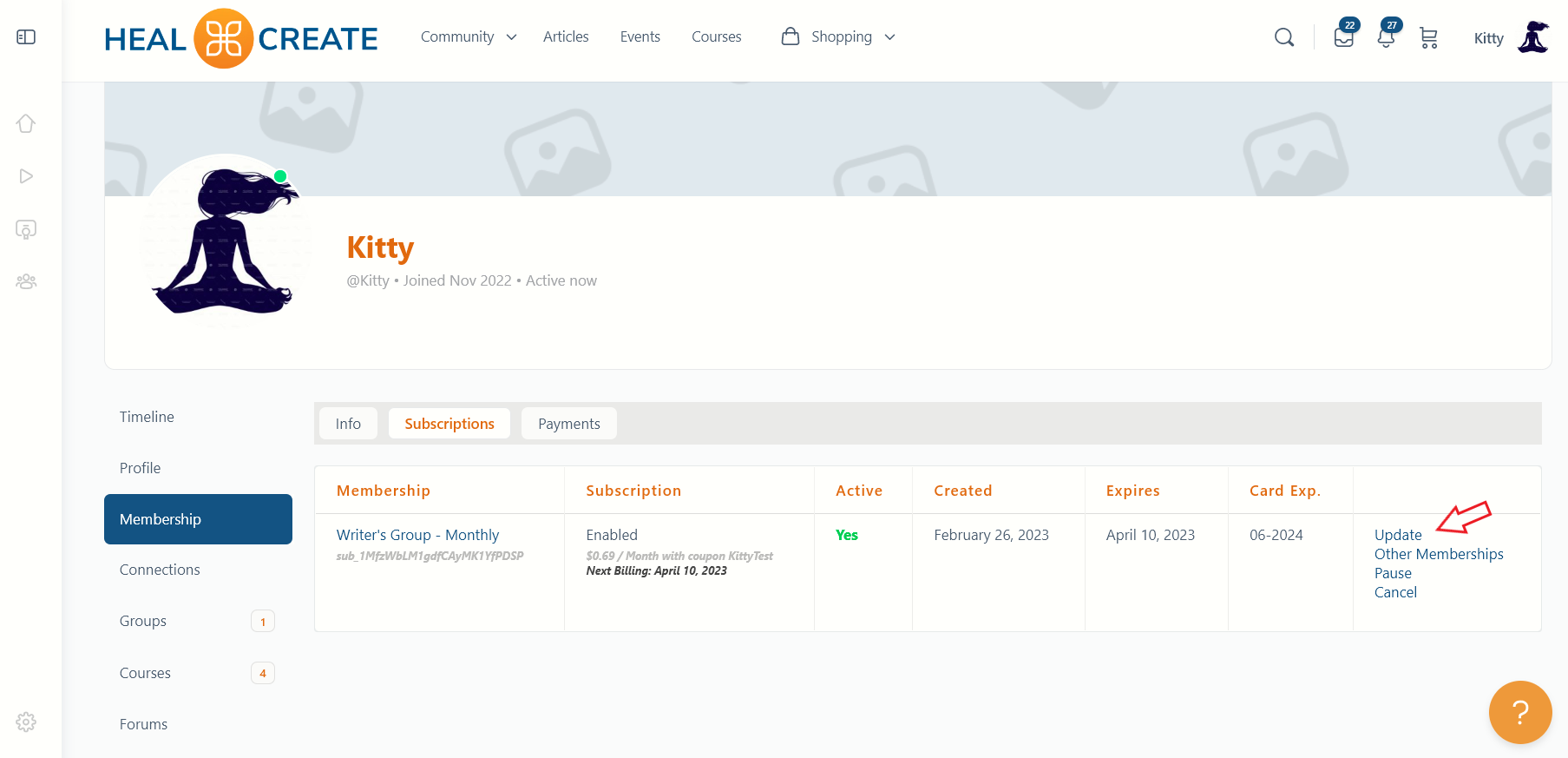 You'll be directed to the membership page where you can view/update your subscription details and payment method. If you scroll to the right you'll see several options. Select Update to update your payment information.